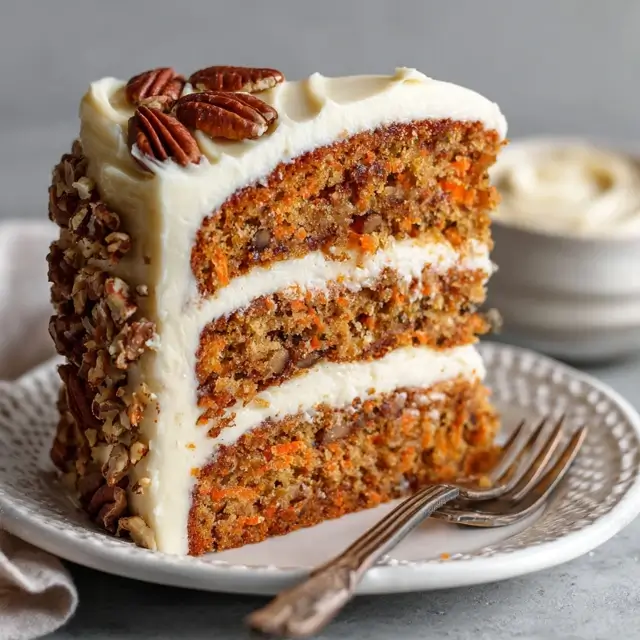 Moist and warm carrot cake topped with rich cream cheese frosting, perfect for any occasion.