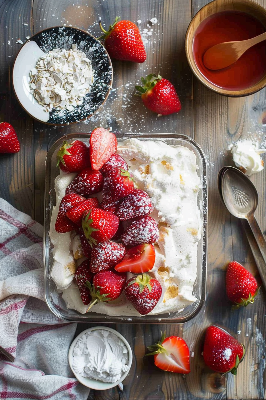 A light and airy layered dessert featuring pre-made angel food cake, fresh strawberries, and creamy vanilla whipped cream. Perfect for summery gatherings with a vibrant, visually appealing red-and-white contrast.